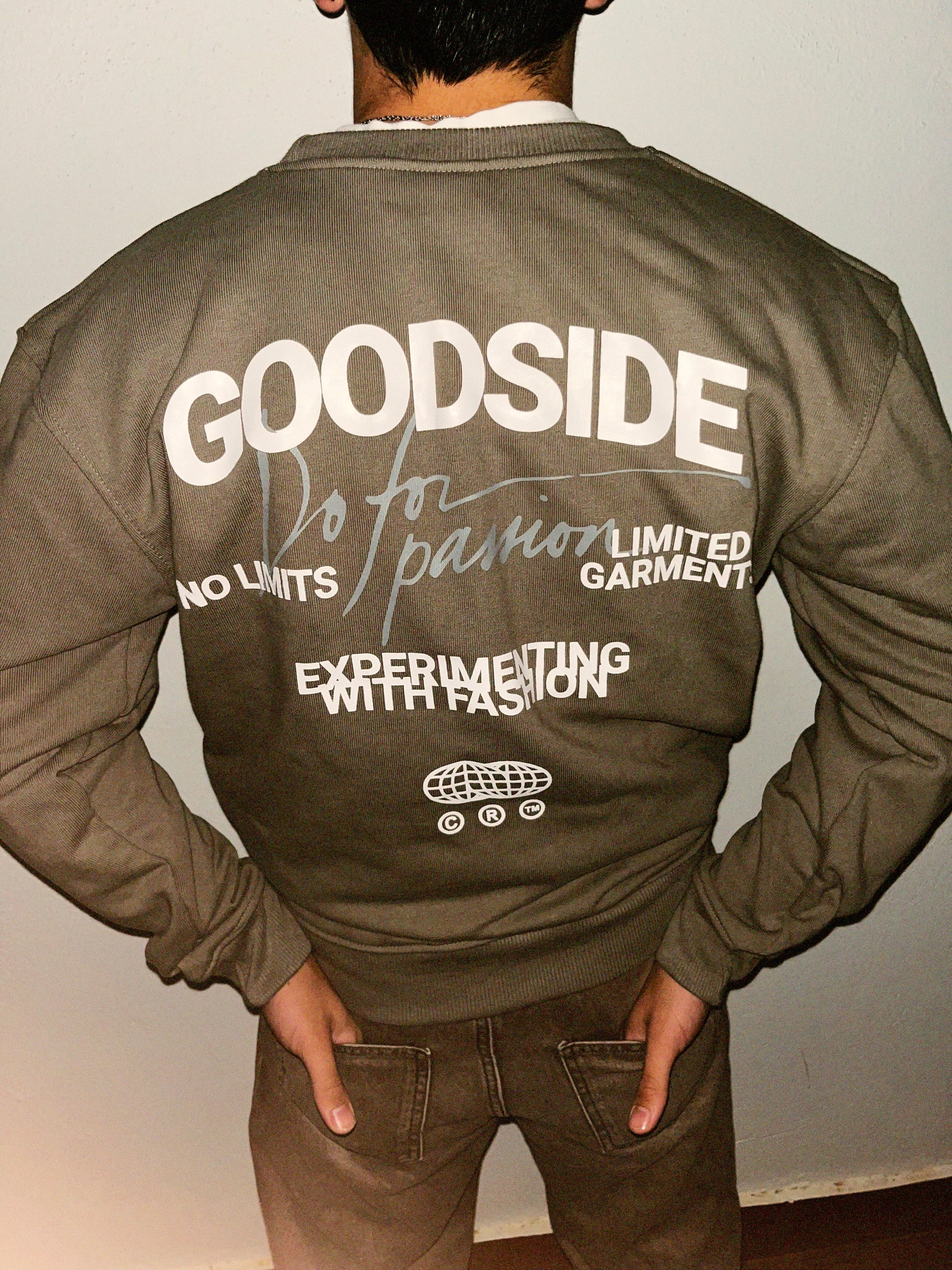 La sudadera Goodside crewneck es una prenda de 450 gsm con un diseño de serigrafía en la parte delantera y trasera.